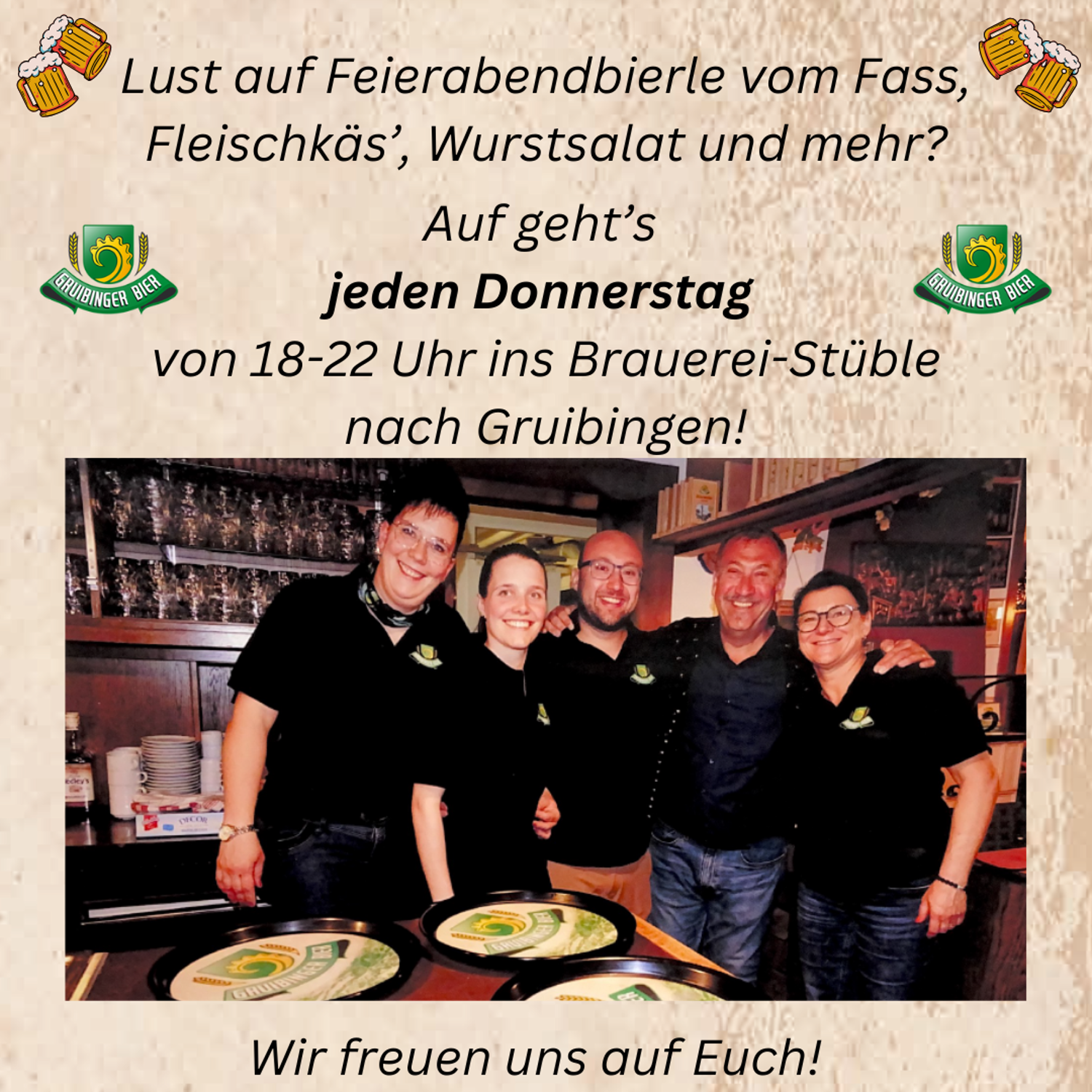 Am Donnerstag, den 09.04.26 von 18 - 22 Uhr sind wir für Euch da mit frisch gezapftem "Gruibinger" und leckeren Vesper! Wir freuen uns auf Euch! Eure Familie Hilsenbeck mit dem Brauerei-Team